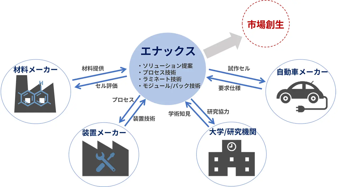 このうち、アルミラミネート型は円筒形などと比較し放熱性に優れ、軽量でなおかつ大電流に対応可能な設計にも適しているという強みがあることから、超高入出力リチウムイオン電池に適していると我々は考え、ENAXでは設立当初より、一貫してリチウムイオン電池の研究開発をラミネート型リチウムイオン電池にて行ってきました。様々な材料種のリチウムイオン電池を製品化してきた豊富な知見と、多くのパートナー企業様・研究機関様とのアライアンスを活用することで、最適かつ迅速な製品開発を実現します。