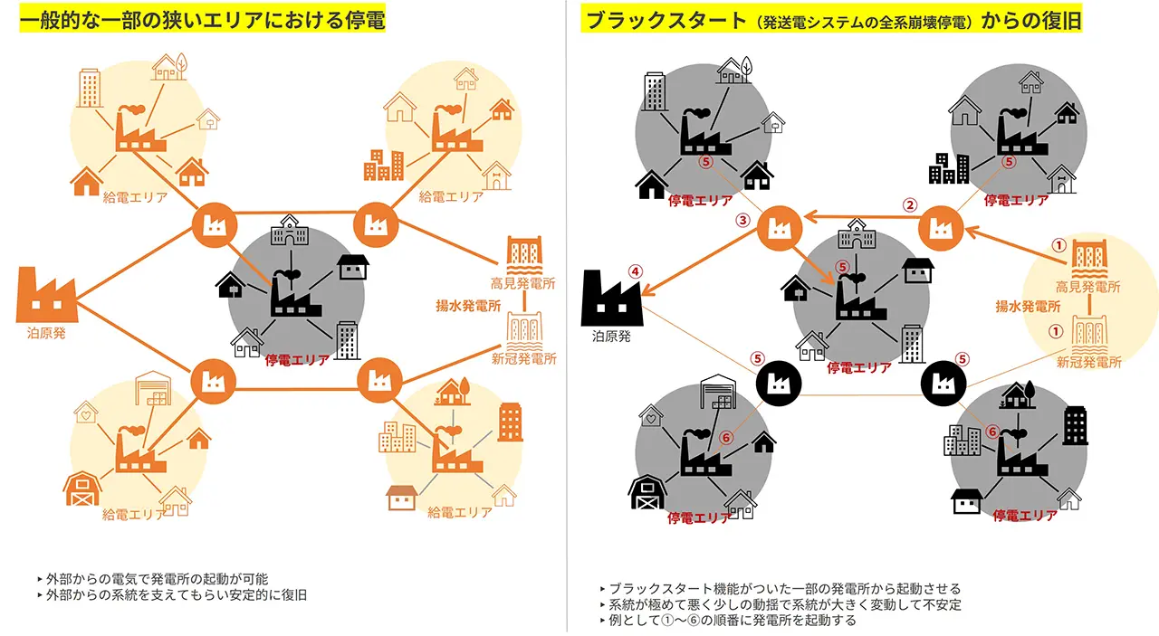 ブラックスタート用電源として活用できる揚水発電。しかしながら広大な土地や設備、コストや時間を必要とするため全道の安定的な電力を確保するには数が少なすぎるといったことが課題になっています。