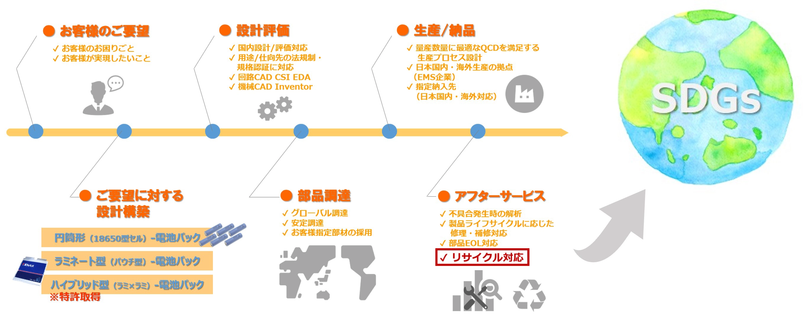 当社で開発したバッテリー製品がご使用済みとなった際は、廃棄/リサイクルを自治体にかわり対応いたします。設計~開発~製造~廃棄/リサイクルの一連のバリューチェーンを確立し、トータルソリューションでお客様にご提案いたします。